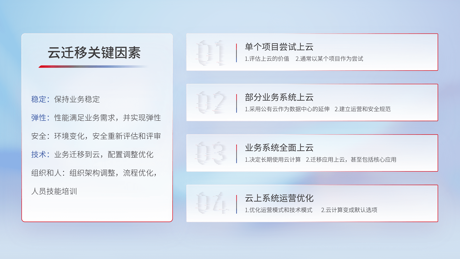 结合实际业务,,,从规划设计、、、云平台选型、、云原生改造、、、、数据迁移、、集成交付,,迁移全过程为客户识别最佳上云路径,,做好风险识别管理,,,,设计网络架构、、身份权限、、、安全审计合规、、操作审计、、日志审计、、、监控告警策略、、、、多站点容灾设计等,,,,对云上基础设施进行整体规划,,,提升IT治理水平,,以满足弹性、、高可用、、高性能的需求。。。。