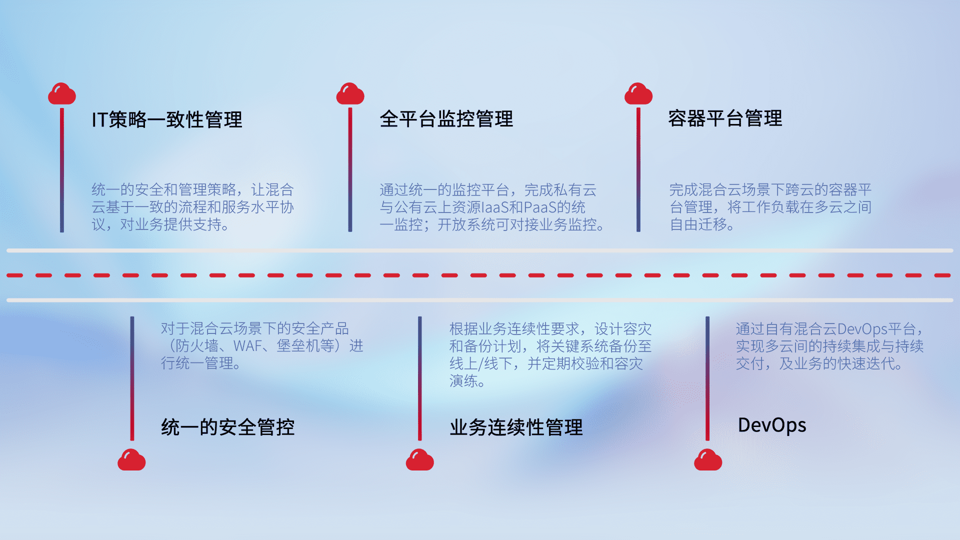 通过多云纳管,,,以统一的资源数据模型把客户的云资源进行抽象和封装,,进而实现对多云资源的统一操作,,,保障云资源管理的可靠性、、、稳定性与可用性。。量身定制化运维内容,,配置、、、、开发运维、、、、补丁管理、、、、备份、、、、监控、、、认证和访问管理、、审计和日常巡检等,,保障在用云过程中的可靠度,,,稳定度以及高可用率。。
